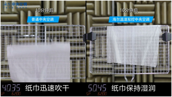 據視頻顯示,2張沾濕的紙巾分別在同等條件環境下試驗,5分鐘后,普通中央空調房間的濕度下降到53%并持續下降,紙巾逐漸風干;海爾溫濕雙控中央空調房間的濕度下降到55%并漸趨穩定,紙巾保持濕潤。10分鐘后,普通中央空調房間濕度下降到40%臨界值并繼續下降,濕紙巾徹底變干并被吹落;海爾溫濕雙控中央空調房間濕度一直保持在50%左右,濕紙巾依舊濕潤,甚至能擰出水。