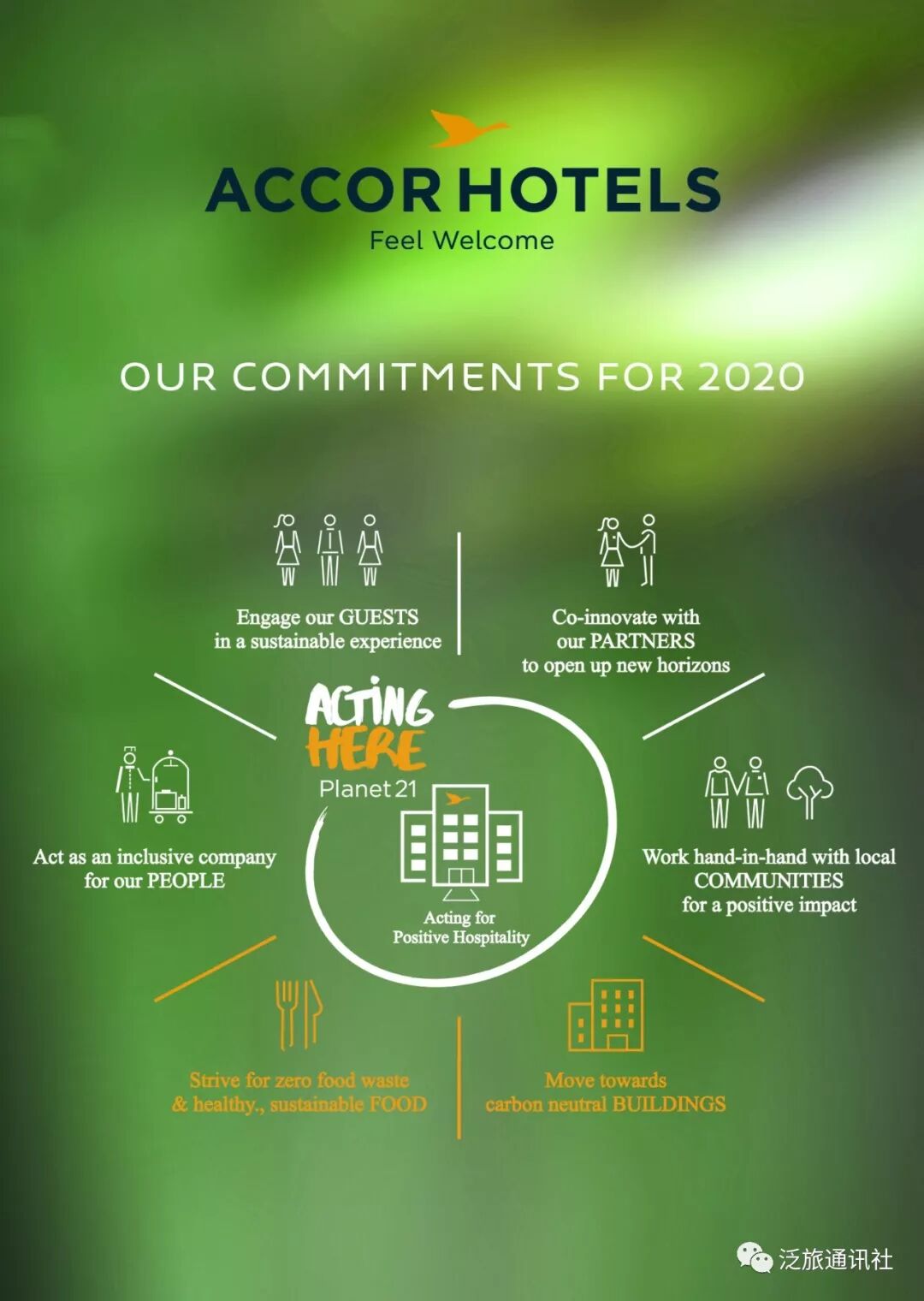 “21世紀地球”(Planet 21 - Acting Here!) 是雅高酒店的企業社會責任計劃,我們全球所有的酒店與品牌均予以落實。為了解決雅高酒店面臨的主要問題并推動創新,該計劃定義了一系列需要在2020年之前實現的目標。該計劃共含六大主要方面:其中四個針對我們的主要利益相關方,包括員工、客戶、合作方(酒店業主與供應商)及酒店當地社區,另外兩個針對我們優先關注的領域,即餐飲與建筑。